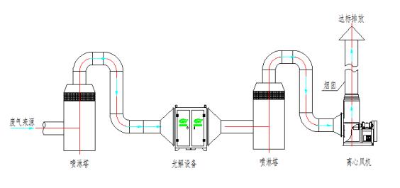 制藥廢氣處理考慮運營成本及安全性,本方案工藝路線擬定采用“通風系統(風機、收集罩、管道)+預處理系統(水洗塔)+核心凈化系統(UV光解凈化設備)+后處理系統(堿淋塔)”來進行制藥廢氣處理。工藝設備圖如下: