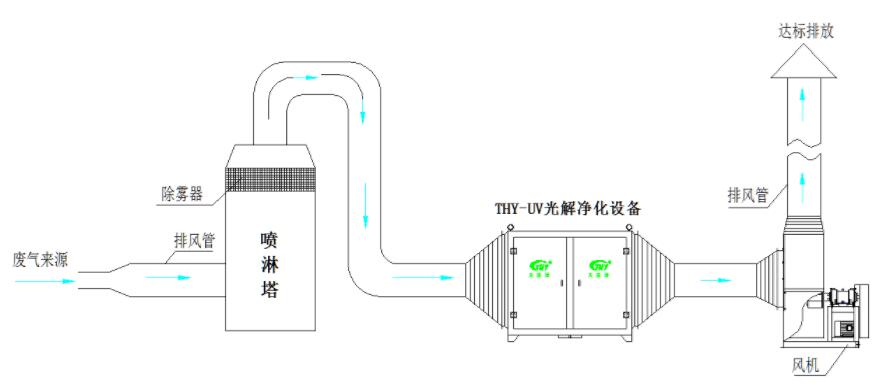 第一階段:廢氣經過一級水噴淋對廢氣中氨、醇等易溶于水的成分以及灰塵進行去除預處理,再進入下一道工序。